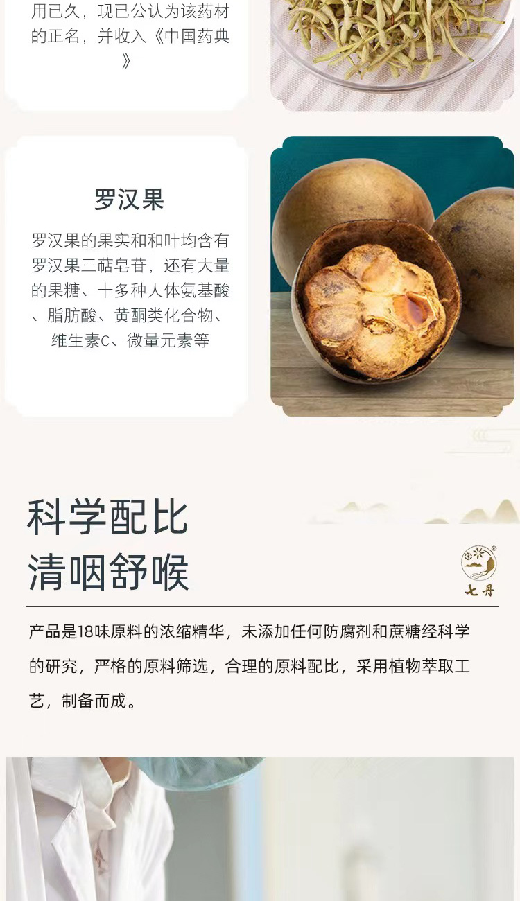 主要成分:三七花、罗汉果、胖大海、余甘子、金银花、鱼腥草、荷叶、玉竹、桔梗、天然薄荷脑、桑叶、菊花、淡竹叶、橘皮、马齿苋、乌梅、桅子、香橼