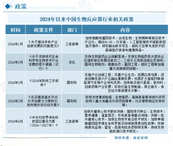展会可以了解相关发酵设备情况,目前国内生物制药设备目前正处于快速发展阶段,但与国际先进水平相比仍存在一定差距。近些年生物制药产业的蓬勃发展,中国生物制药设备市场需求也进一步扩大。但充满机遇的同时,生物制药设备行业面临着较大的挑战,设备中高端市场缺位较严重,行业整体创新能力比较弱,药企对国产生物制药设备的信任度较低,生物制药的中高端设备主要依赖于进口。以下是涉及2024年中国生物反应器行业相关政策。