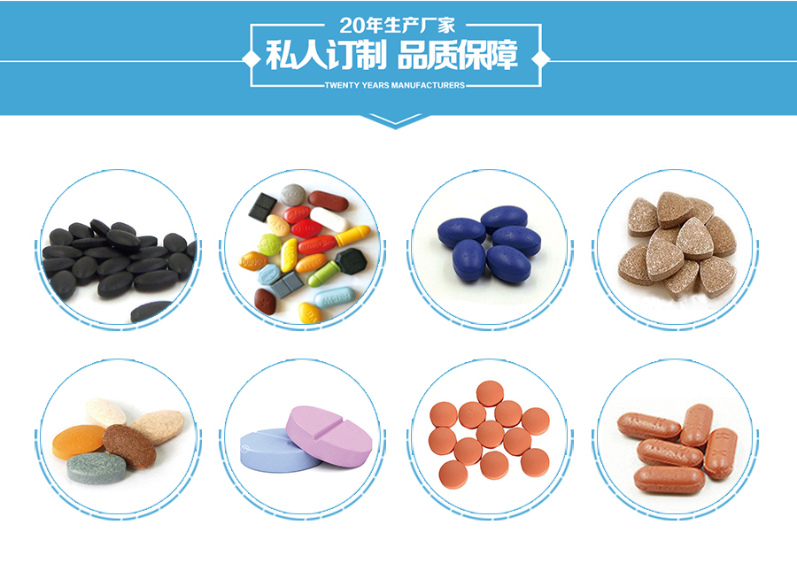 片型多样:拥有300多套片剂模具,可生产长圆形、 椭圆形、三角形、圆形、太阳形、卡通型、动物型、水果型等多种片型;