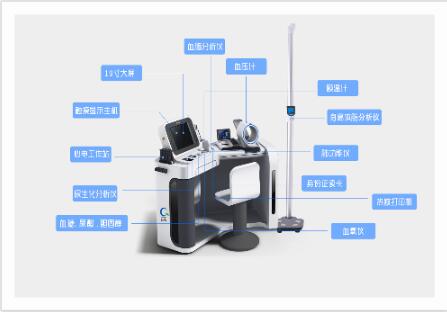 健康驿站配置身高体脂分析仪、额温计、全自动血压计、血氧仪、血脂分析仪、尿液分析仪、心电、肺功能仪、血糖尿酸胆固醇检测仪等医疗检测设备。社区居民可自助检测血压、血氧、血糖、总胆固醇、尿酸、脉搏、心率、肺功能、身高体重、体温、BIM等体征数据,还可在医生协助下完成12导联心电检查、尿生化检查等常规项目。