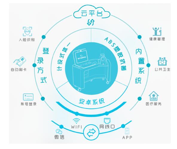 勤成“健康驿站”应由设备主机与配套的医疗检测设备组成。产品设计符合医疗健康“互联网”化的需求,采用一体式设计,ABS塑胶抗菌材质,安卓系统,集成度高。检测设备多样且简便易用,操作流程清晰并具备相应的语音引导,社区居民可轻松使用。 “驿站”软件平台应基于安卓系统,可以便捷的实现平台维护与功能升级。软件平台对WIFI、4G通讯应具有良好的支持,可以方便通过微信、居民健康APP等向用户推送健康资讯与数据。
