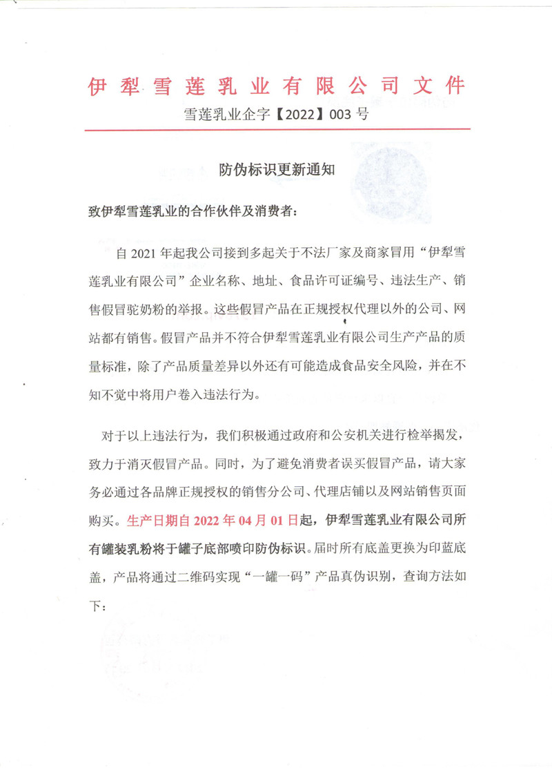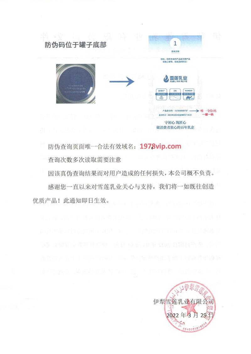 生产日期自2022年04月01日起,伊犁雪莲乳业有限公司所有罐装乳粉将于罐子底部喷印防伪标识。届时所有底盖更换为印蓝底盖,产品将通过二维码实现“一罐一码”产品真伪识别,查询方法如下: