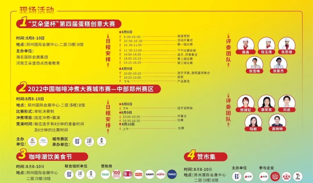 2022郑州烘焙展展会现场同期举办“艾朵堡杯”第四届蛋糕创意大赛、2022中国咖啡冲煮大赛城市赛—中部郑州赛区、咖啡潮饮美食节、赞市集、趣味咖啡拉花对抗赛等精彩活动,汇聚行业内领军人物,共探烘焙与茶饮行业前沿趋势,现场参观、采购、加盟、零售,线上线下多重渠道刺激转化,实现企业B端+C端双收获!