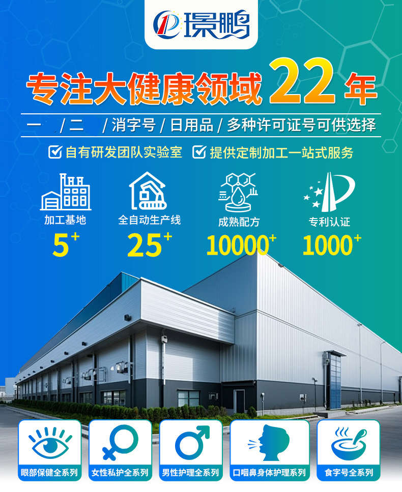 璟鹏生物为您提供完整的OEM贴牌加工服务,产品策划(剂型、配方、工艺制定)、商标注册、包装设计、产品注册备案审批、下单生产、检验出厂、全程无忧一件代发。